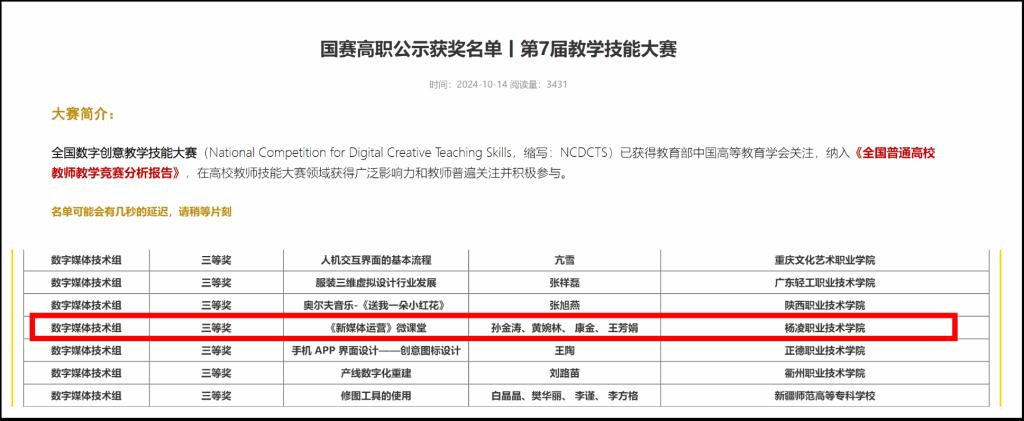 10月14日,第七届全国数字创意教学技能大赛获奖名单公布。信息工程学院教师孙金涛、黄婉林、康金、王芳娟荣获“数字媒体技术组”三等奖。