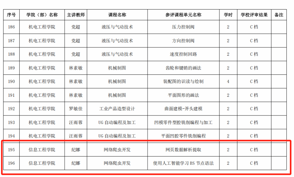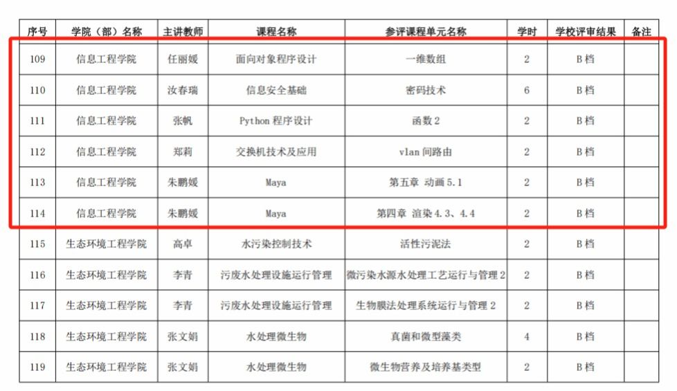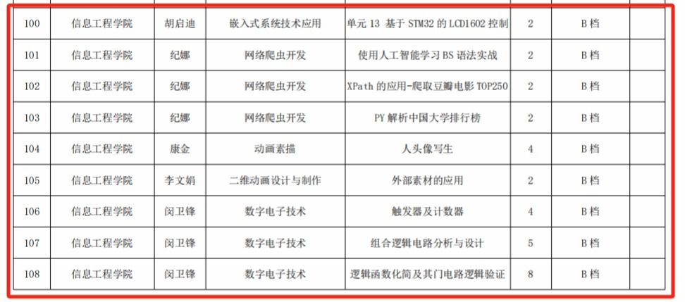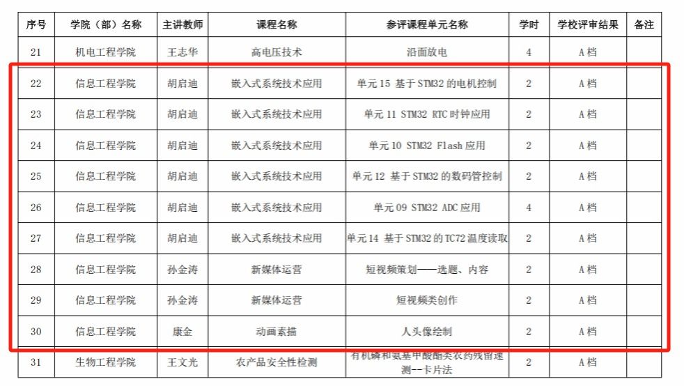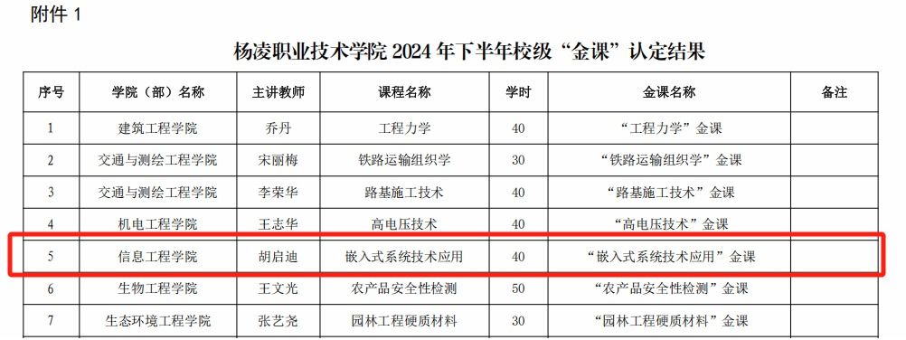 4月8日,杨凌职业技术学院2024 年下半年校级“单元金课”评审结果公布,信息工程学院教师胡启迪主讲的《嵌入式系统技术应用》课程获得校级“金课”认定。本次共有56个“单元金课”评审通过,其中A档9个,B档15个,C档32个,共计159个学时。