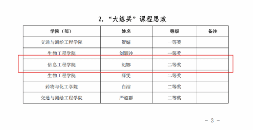 5月28日,2025年度思政课程和课程思政教师“大练兵”展示活动校级评审结果公布,信息工程学院纪娜老师荣获课程思政二等奖。