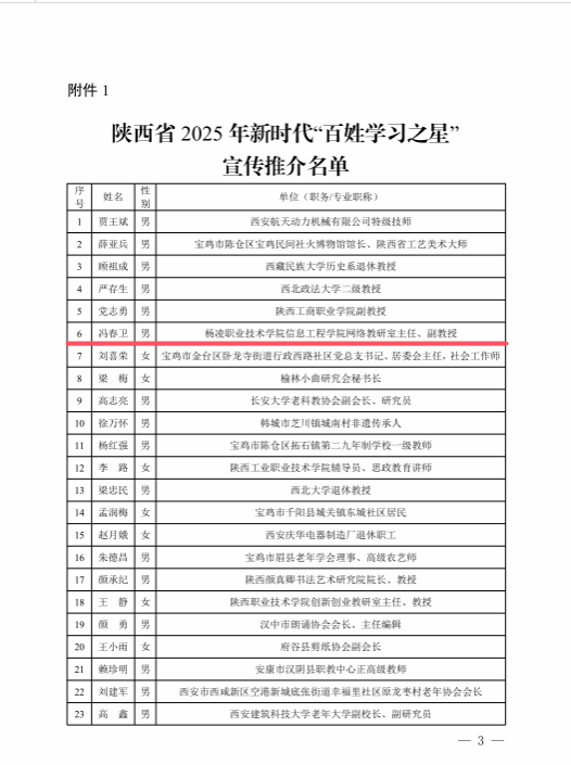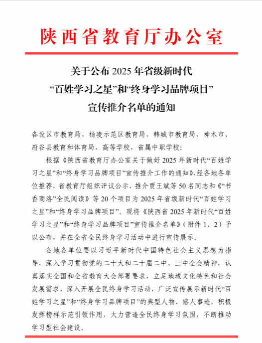 近日,省教育厅公布了2025年陕西省新时代“百姓学习之星”和“终身学习品牌项目”宣传推介名单,我院副教授冯春卫荣获陕西省“百姓学习之星”荣誉称号。