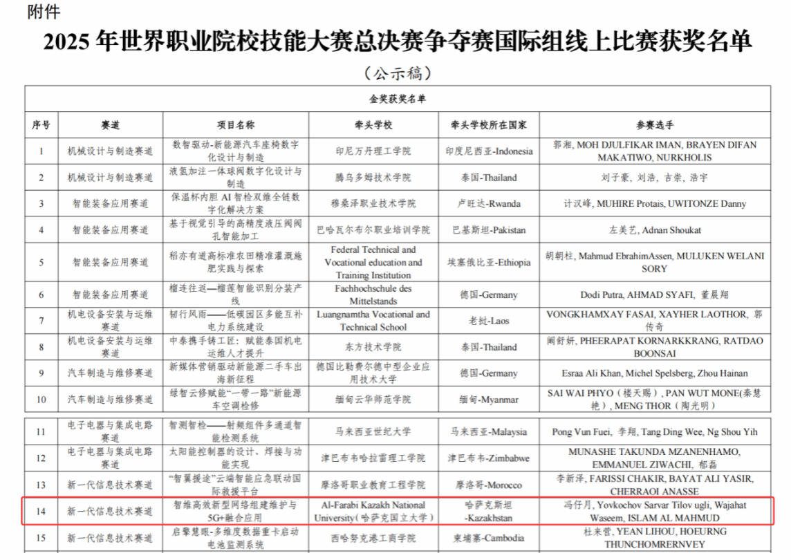 10月13日,2025年世界职业院校技能大赛总决赛争夺赛(国际组)获奖名单正式公布,由我院组建并主导的跨国参赛团队,在新一代信息技术赛道中脱颖而出,荣获金奖,实现了陕西省在该国际赛事中金奖零的突破。