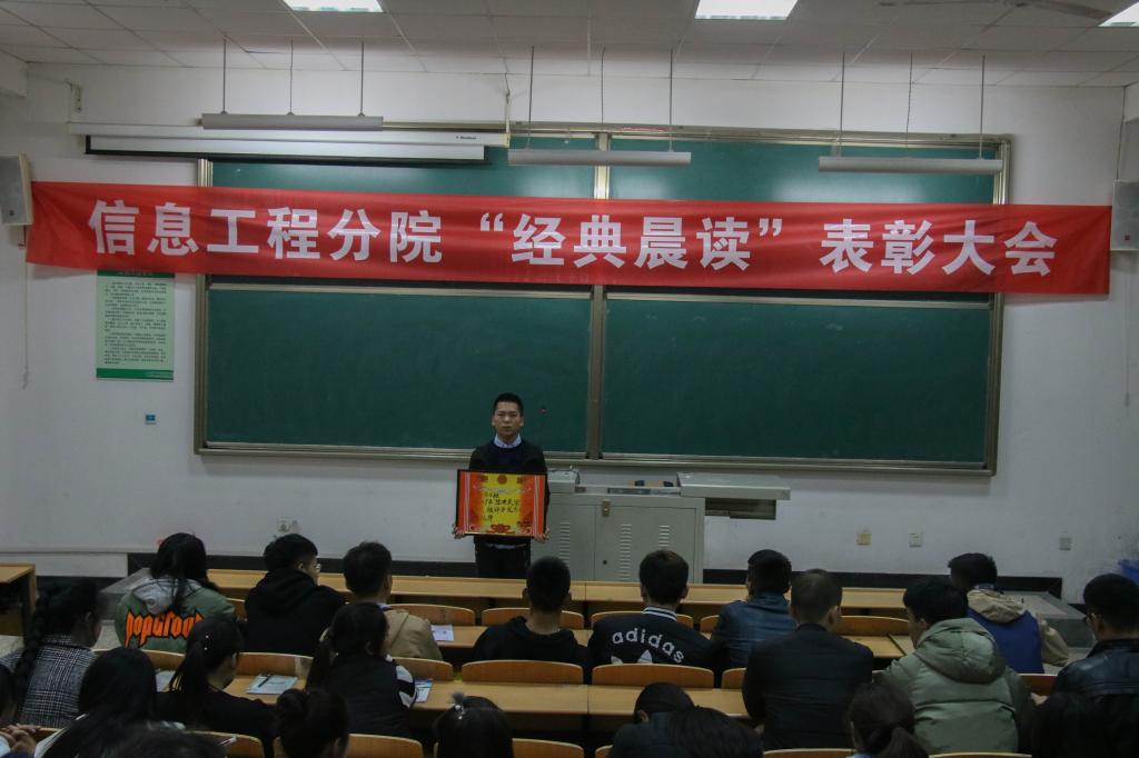 2017年11月14日晚上7:00,信息工程分院在北校区BOA-121教室举办了“中华经典晨读百篇表彰大会”。此次大会由分院学生会纪检部与实践部联合举办,各班班级代表和学生代表共150多人参加了此次表彰大会。