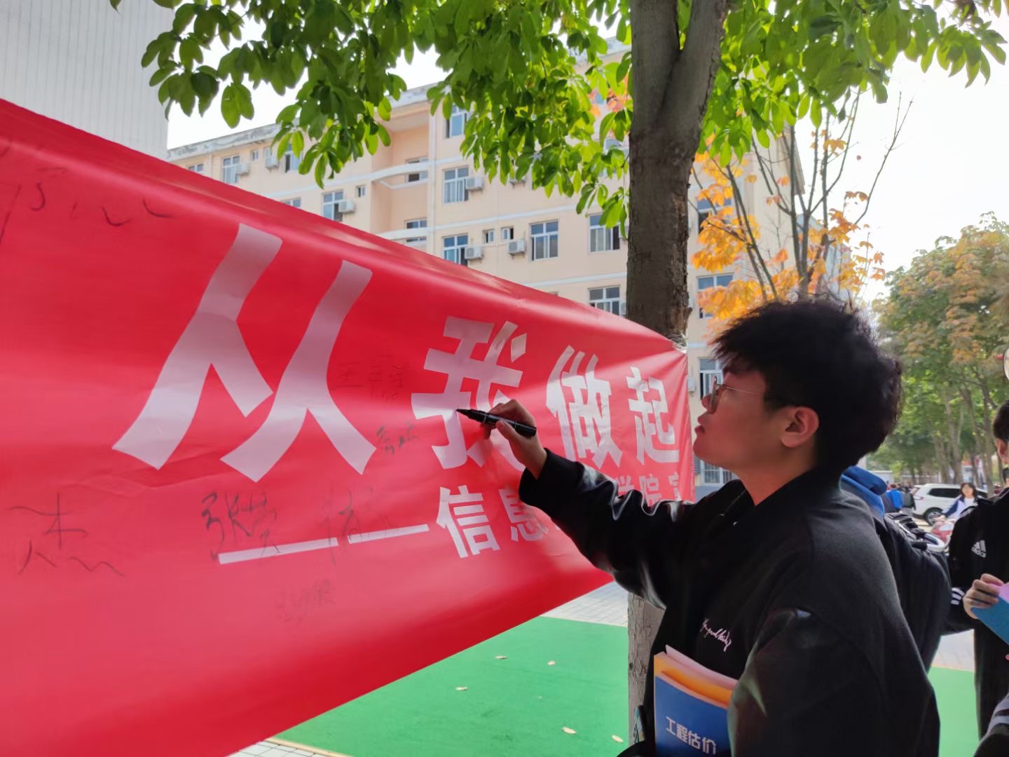 “一米一粟当思来之不易,厉行节约从我做起”。10月21日,信息工程学院同时在南北两个校区食堂门前设置宣传横幅,组织开展签名承诺活动。因近期疫情影响,本次活动严格控制活动人数,减少人群聚集,每班选派两名学生代签名承诺。活动现场,秩序井然,不少路过的师生也来到签名横幅前,签上自己的名字,承诺将自觉践行“光盘行动”,不负“粮”心,养成珍惜粮食、厉行节俭的好习惯,向“舌尖上的浪费”说“不”。为表彰自觉光盘的“节约卫士”,将福利带给广大同学,学院提前准备了绿植、钥匙扣、水杯、玩偶等小礼品。师生用餐过后,可凭借点赞截图或光盘打卡照片前往兑换点进行抽奖,现场气氛热烈,反响良好。