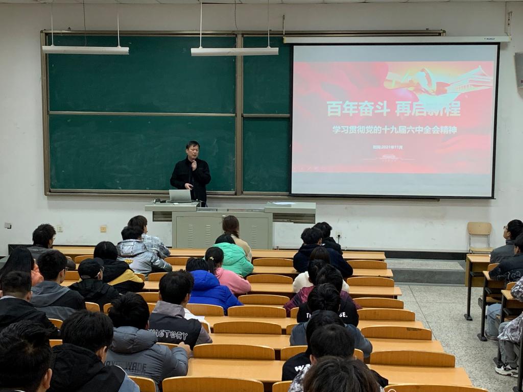 孟琦老师紧扣十九届六中全会审议通过的《中共中央关于党的百年奋斗重大成就和历史经验的决议》和习近平总书记的重要讲话进行解读,通过围绕四个历史阶段回顾总结百年来中国共产党践行为中国人民谋幸福、为中华民族谋复兴的初心使命所进行的奋斗、牺牲和创造,回顾总结党的百年奋斗历程和重大成就。动员同学们要学习好、宣传好、贯彻好党的十九届六中全会精神,与自己的学习、生活和工作紧密结合起来,脚踏实地、求真务实。
