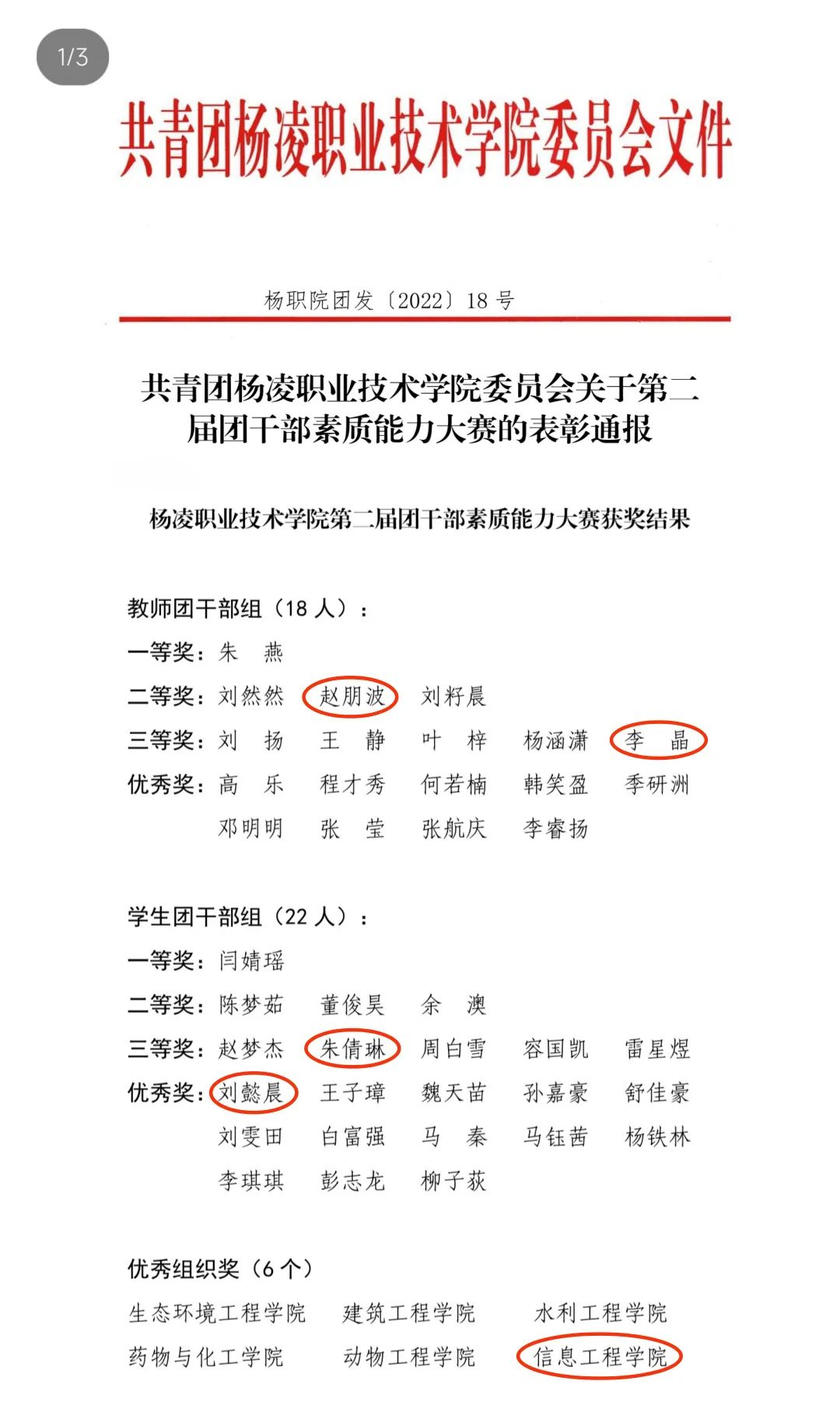 近日,我院选派的2名教师团干部和2名学生团干部在杨凌职业技术学院第二届团干部素质能力大赛中喜获佳绩,其中,赵朋波老师获得教师团干部组二等奖,李晶老师获得教师团干部组三等奖,计算机应用技术20068班团支书朱倩琳同学获得学生团干部组三等奖,计算机应用技术21077班团支书刘懿晨同学获得学生团干部组优秀奖,两名学生团干部并获得参加省赛资格。此外,我院还荣获本次大赛“优秀组织奖”。