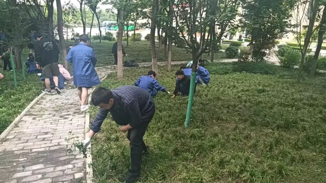 辅导员崔建鹏等几位老师和同学们都共同参与到拔草活动中,大家以小组为单位,展开了一场紧张的“拔草比赛”。不怕脏,不怕累,每位同学都在汗流浃背中感受着劳动的意义。在拔草的过程中同学们虽然累,但是依然能听到他们爽朗的笑声和看到脸上充满朝气的笑容。