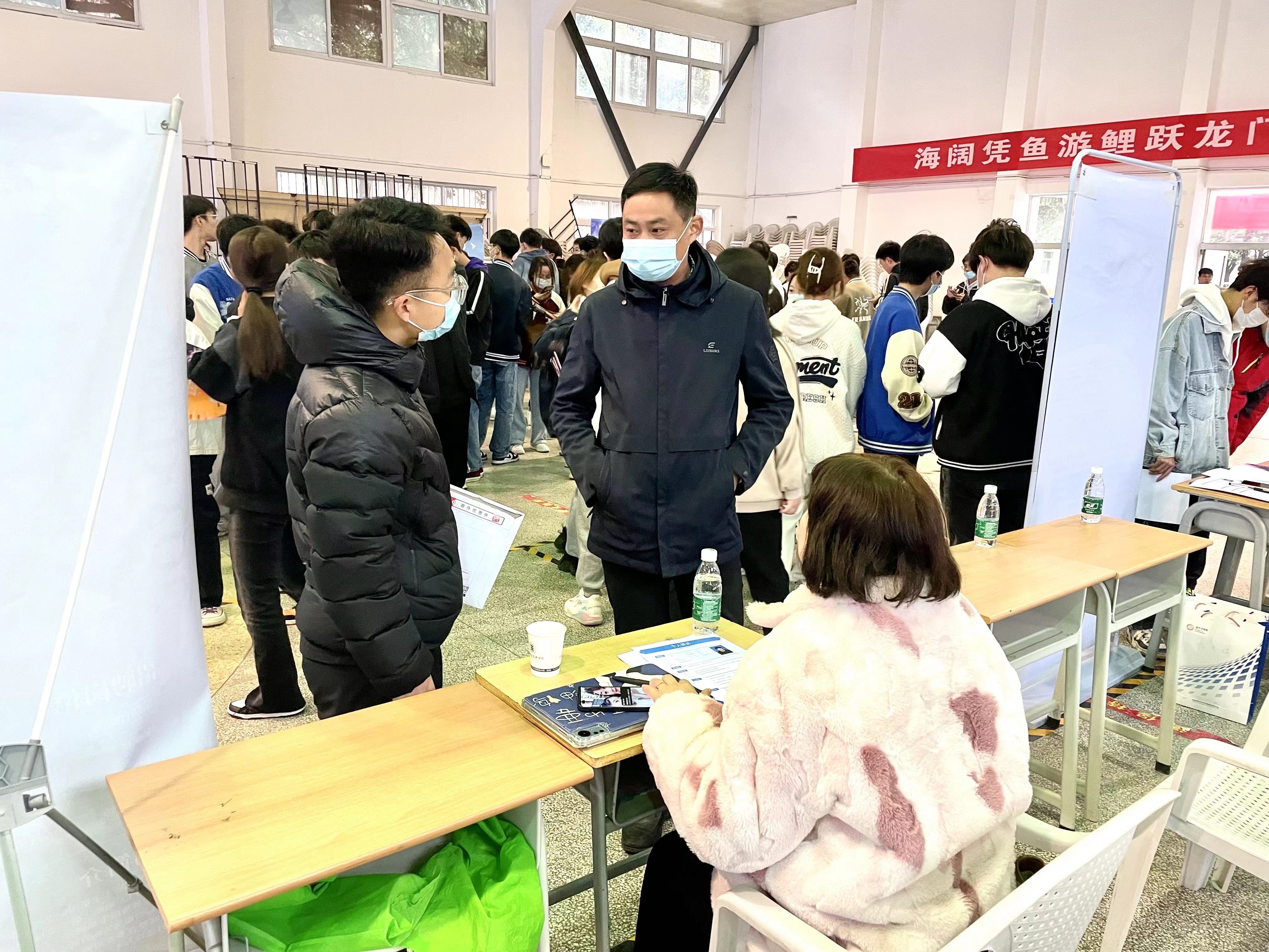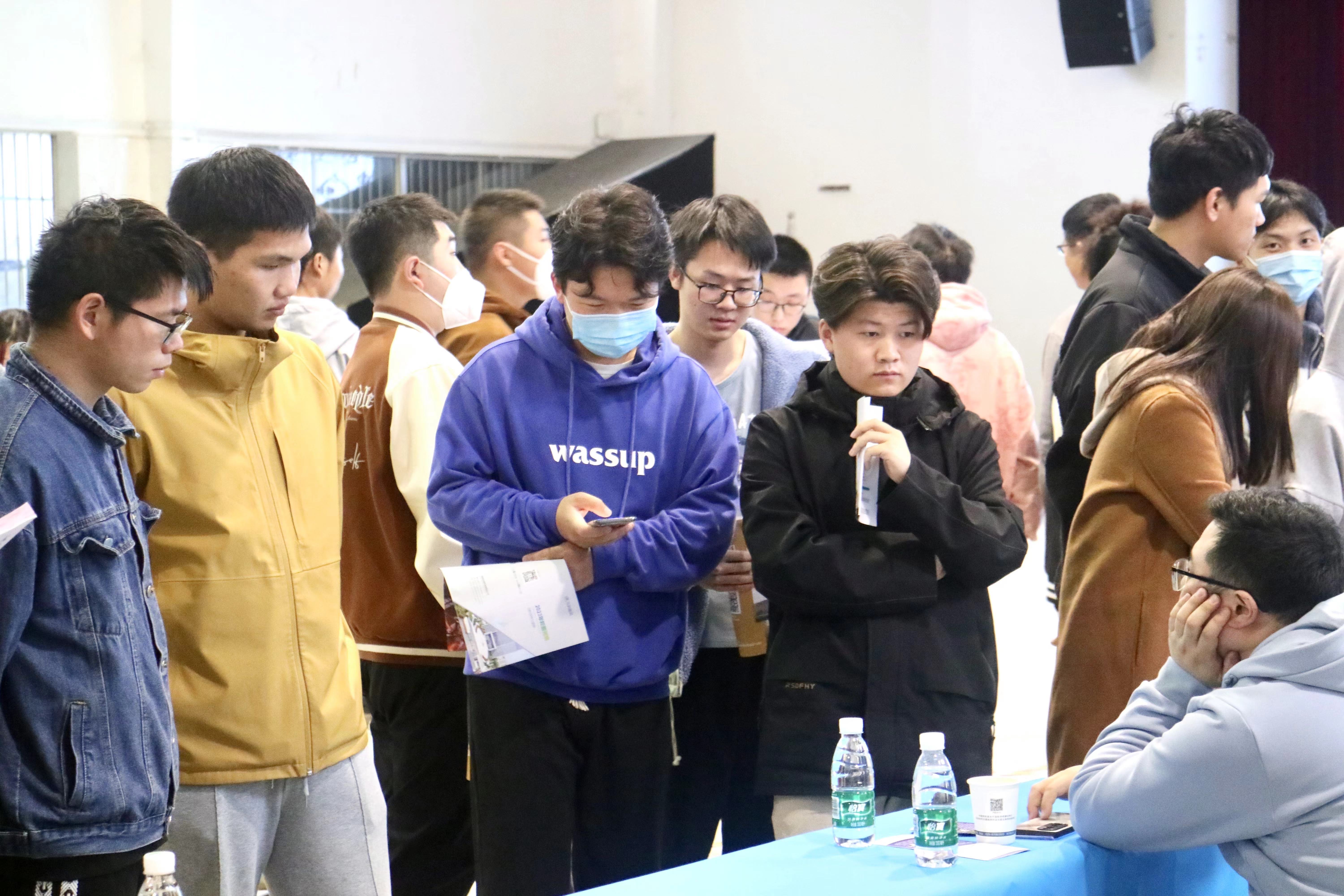 招聘会场现场气氛热烈,用人单位耐心向学生解疑答惑,同学们带着自己精心准备的简历积极与招聘单位沟通,主动了解用人单位情况,招聘会后企业直接进行面试,现场与学生达成就业意向。