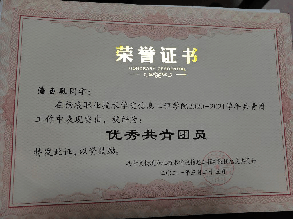 在2020-2021学年度表现突出,成绩优异被评为优秀共青团员。