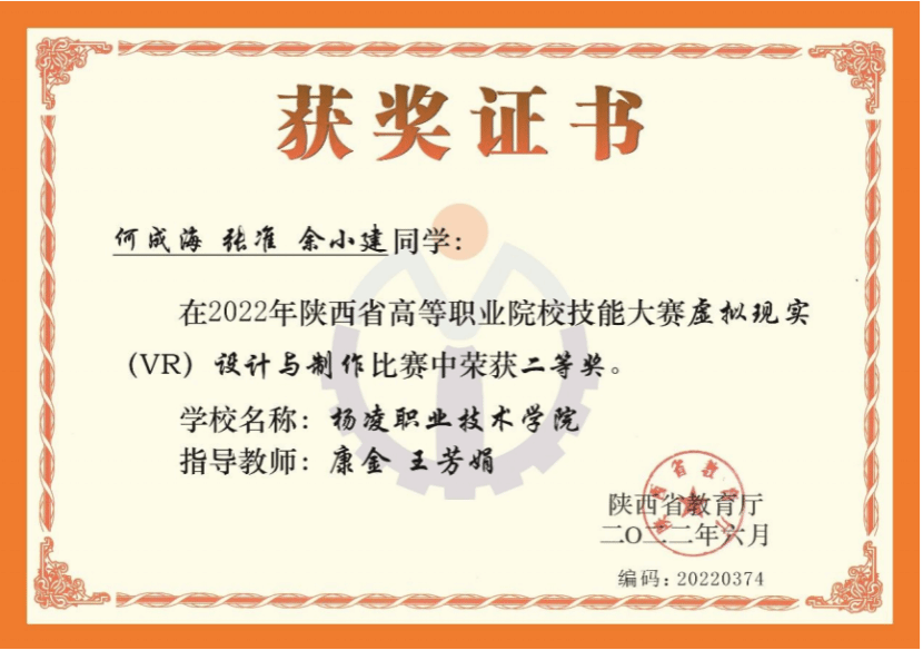 图25 2022年动漫制作技术专业学生获陕西省技能大赛“虚拟现实(VR)设计与制作”二等奖