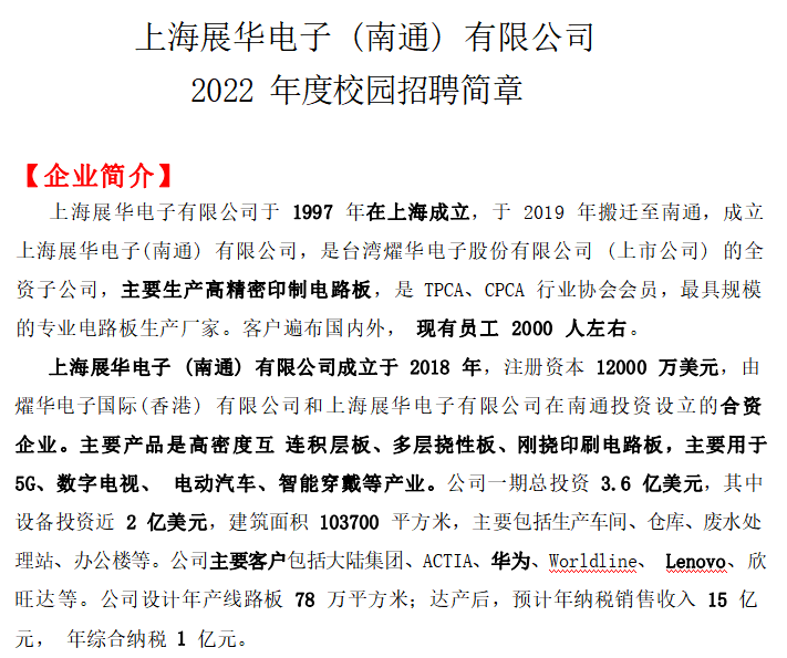 【招聘信息】上海展华电子 (南通) 有限公司招聘简章