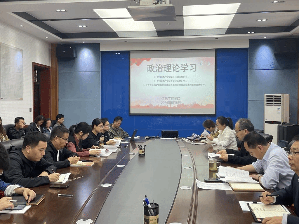 按照学院党总支政治理论学习计划安排,5月6日下午,信息工程学院党总支组织全体党员在秦风楼4楼会议室开展政治理论学习,要求大家认真学习,深刻领悟会议精神,做好学习笔记。