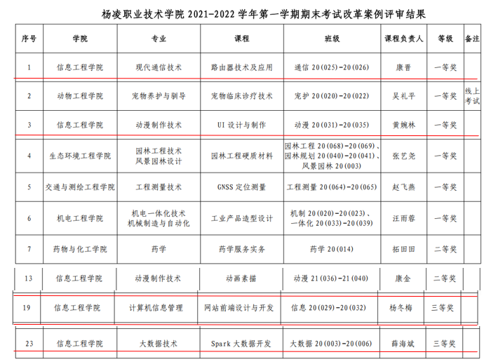 近期,学校公布2021-2022学年第一学期期末考试改革案例评审结果,我院5门课程考试改革案例获评学校优秀案例,其中一等奖2个、二等奖1个、三等奖2个。