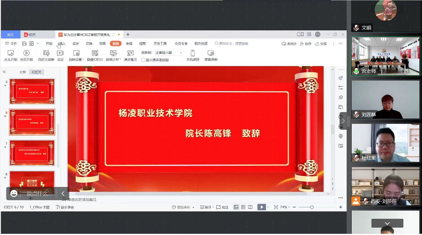 2022年10月26日上午,订单班以线上形式开班。信息工程学院院长陈高锋、实训科长陈阳、办公室主任王巍、专业教师代表汝春瑞、深圳讯方技术有限公司负责人及5名订单班同学参加开班仪式。陈高锋院长在开班仪式上介绍了我院同深圳讯方技术有限公司在专业建设、实验室建设、学生实习就业等方面取得的成果,并鼓励我院订单班同学抓住此次机会,成为适应计算机产业链发展的精英型人才。开办仪式上,订单班同学进行了宣誓,表示将在订单班学习期间严格服从企业和学校管理,努力学习专业技能,并顺利通过华为HCIE认证考试,入职深圳讯方公司云计算工程师岗位。