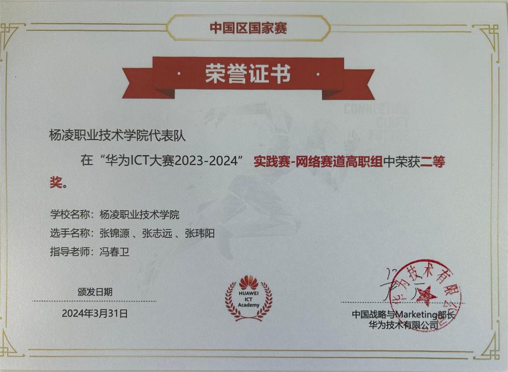 图4 计算机专业学生荣获“华为ICT大赛2023-2024”全国总决赛实践赛-网络赛道高职组二等奖